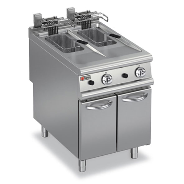 Two pots , V shape electric fryer Totally stainless steel 2 x 10 Litre capacity Complete with two baskets and lids Total power – 3 phase, 2 x 9kW