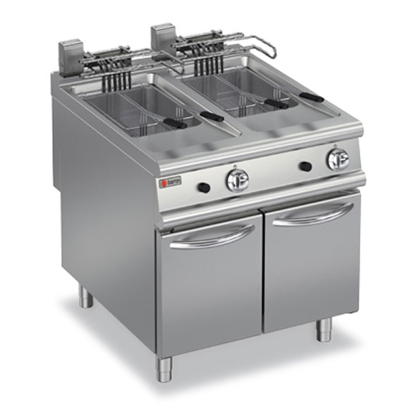 Double pan, V shape electric fryer Totally stainless steel 2 x 20L capacity Complete with four baskets and lids Total power – 3 phase, 34.4kW