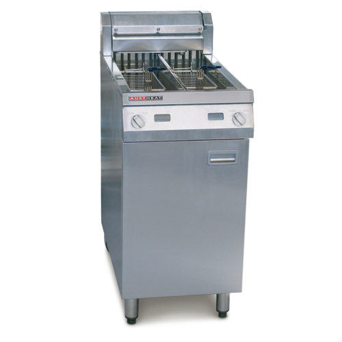 Double pan with two baskets, 2 x 14 litre electric fryer for consistently delivering high quality, high volume fried food Two tanks with individual controls allows separation of flavours and ability to shut down one tank in quieter times High performance by balancing high output with fast recovery Easy to clean – features elements that swing out and up in seconds, providing access to a smooth open tank for easy cleaning. Dual control thermostats enabling easy switching between cooking and idle settings for each tank. Also peace of mind with second thermostat as a back-up Low cost to purchase and run Less heat pumped into your kitchen saving air-conditioning costs and maintaining a comfortable working environment Not having a gas flame means Austheat electric fryers deliver a cleaner working environment by not burning the available oxygen or emitting burned and unburnt gases into your kitchen Electric emersion elements can outlast gas burners and replacement costs usually less. Fitted with safety thermostat with manual reset over-temp safety cut-out Removable front door allows easy operation and maintenance