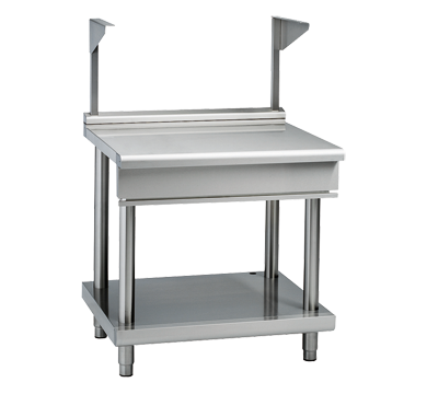 900mm bench top with salamander support on leg stand 3.5mm thick compound work surface Adjustable feet at front with rear rollers Easy clean, installation and service