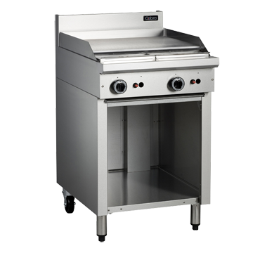 600mm griddle cooktop on open cabinet base 2 x 20MJ/hr griddle burner Stainless steel finish Adjustable front feet and rear rollers