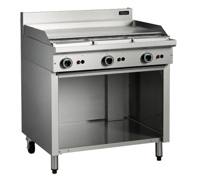 900mm griddle on open cabinet base 3 x 20MJ/hr griddle burners Variable high to low controls Cast iron burners and vitreous enamel pot stands