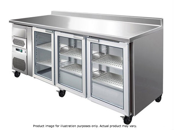 TROPICALISED Three Door All Stainless Steel* Bar Fridge with 50 mm Splashback WITH CUTLERY DRAWER Refrigerated 2 – 8ºC, Ambient 43ºC & 75% RH 1030 bench height + 50 mm splashback 2 levels of shelving plus floor Stainless Steel shelves Danfoss compressor Dixell digital temp. controls & read-out Fan-forced evaporator cooling Internal corners rounded for hygiene & easy cleaning Auto defrost Self-evaporating drainage Insulation is CFC & HCFC free Touch close doors Castors Handy utensil drawer Capacity 543 ltr * gal metal back