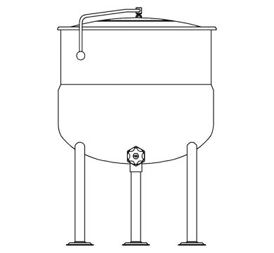 303 litre capacity direct connected steam tri-leg kettle 2/3 steam jacket Hemispherical design kettle bottom superior heat tubular Stainless steel mounting legs to supply steam and condensate return pipes 2” (50mm) sanitary draw-off valve