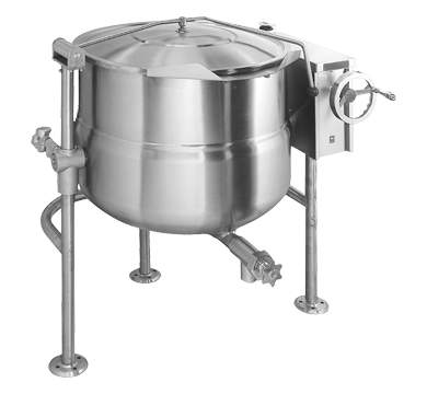 151 litre capacity direct connected steam tri-leg tilting kettle 2/3 steam jacket Hemispherical design kettle bottom superior heat tubular Stainless steel mounting legs to supply steam and condensate return pipes Reversible tilt handle 90 degree tilt mechanism for complete emptying