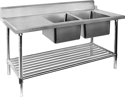 All Stainless Steel Right Inlet Double Sink Dishwasher Inlet Bench Bowl size Bowl size 450 mm wide × 450 deep × 300 high; 65 mm Ø drain hole Bowls are fully welded polished inside & out 700 mm deep × 900 mm high Specially designed for quick & simple assembly Come with instruction manual & tools Supplied flat-packed for ease of transport 4 legs per bench – 2100 & 2400 mm wide benches have 6 legs 1.2mm material; SUS304 grade (18/8); Hairline finish 15 mm wet edge Left or right bowl positioning Bowls are fully welded polished inside & out Splashbacks Stainless steel backing All SUS304 lined & bevelled 180 mm high; 30 mm thick Fully enclosed & folded under top Special ‘U’ channel reinforcements under; SUS304 1.2 mm thick – as the bench size increases so does the the number of channels RIGHT side sink inlet bench: When facing the bench the dishwasher inlet & sinks are on the right side.