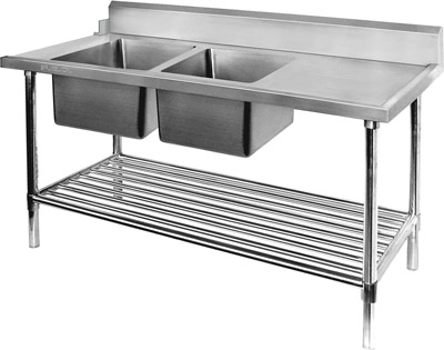 All Stainless Steel Left Inlet Double Sink Dishwasher Inlet Bench Bowl size 450 mm wide × 450 deep × 300 high; 65 mm Ø drain hole Bowls are fully welded polished inside & out 700 mm deep × 900 mm high Specially designed for quick & simple assembly Come with instruction manual & tools Supplied flat-packed for ease of transport 4 legs per bench – 2100 & 2400 mm wide benches have 6 legs 1.2mm material; SUS304 grade (18/8); Hairline finish 15 mm wet edge Left or right bowl positioning Bowls are fully welded polished inside & out Splashbacks Stainless steel backing All SUS304 lined & bevelled 180 mm high; 30 mm thick Fully enclosed & folded under top Special ‘U’ channel reinforcements under; SUS304 1.2 mm thick – as the bench size increases so does the the number of channels LEFT side sink inlet bench: When facing the bench the dishwasher inlet & sinks are on the left side.