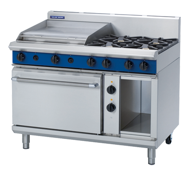 4 burners cooktop range with 600mm griddle 2/1 GN electric static oven 4 x 28MJ/hr open burners, 2 x 20MJ/hr griddle burners Flame failure protection on all burners