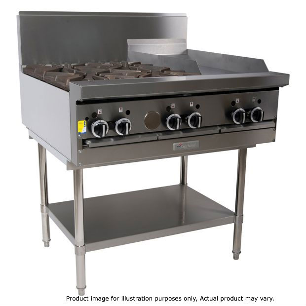 The Garland GF36-4G12T-NG Heavy Duty 4 Burner Restaurant Series Cooktop Optional stainless steel stand with storage shelf to suit full suite Largest useable cooking surface for maximum productivity Two piece Starfire Pro® burners Cast iron "H" burners for best in class temperature consistency ‘Plate rail’ and backguard giving a sleek clean finish The hardest, strongest most durable cooktop