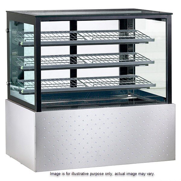1200mm wide Heated Square Stainless Steel Food Display 4 Display Levels Black Trim & Shelving Fan-forced thermal air-flow & humidity 40 to 75°C