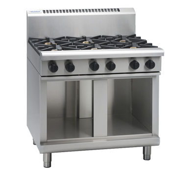 6 burner cooktop on cabinet base 6 x 28MJ/hr open burners Heavy-duty stainless steel finish Flame failure protection on all burners