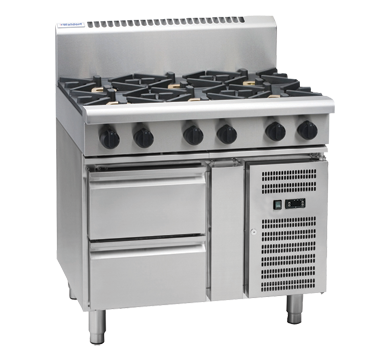 6 burner cooktop on refrigerated base 6 x 28MJ/hr open burners Heavy-duty stainless steel finish