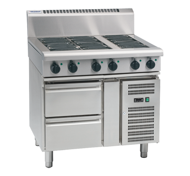 4 radiant element cooktop with 300mm griddle on refrigerated base 4 x 2.4kW radiant elements 1 x 3.6kW griddle element