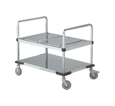 Transport / serving trolley for 2 x Thermoport type 50, 100, 600, 1000 Two stainless steel square frames and platforms Top platform can be steplessly adjusted from 350mm to 700mm height from floor 2 swivel and 2 fixed castors