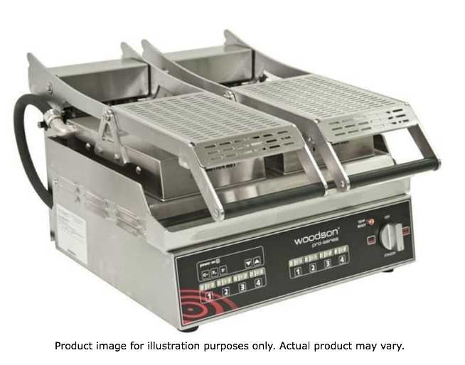 Woodson Pro Series Contact Toaster Computer Controlled. Protective heat shield. 8 x programmable settings. Operate both plates or bottom only. Gas strut assisted top plate for easy lifting. LED Timer Display.