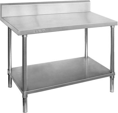 All Stainless Steel Workbench with Splashback and Solid Undershelf 1200mm Wide 700 mm deep × 900 mm high Specially designed for quick & simple assembly Comes with instruction manual & tools Supplied flat-packed for ease of transport 4 legs per bench – 2100 & 2400 mm wide benches have 6 legs Locking drawers available Legs 1.2 mm S/S; 42 mm Ø Fully adjustable S/S polished disc feet that match the legs perfectly Castor kits available (lockable) Benchtops 1.2 mm material; SUS304 (18/8) Llined with XPS board, 20 mm thick & S/S panel Special S/S ‘U’ channel reinforcements under As the bench size increases so does the number of channels Undershelves Height of shelf is fully adjustable, also an extra shelf can be added 1.2 mm S/S Special ‘U’ channel reinforcements under to suit the bench type & size, and as the bench size increases so does the ‘U’ channel width; S/S 1.2 mm thick Splashbacks Stainless steel backing All S/S lined & bevelled 180 mm high; 30 mm thick
