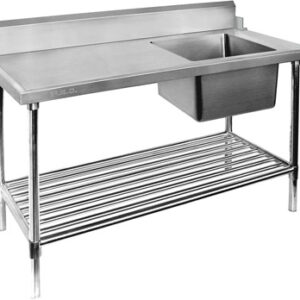 All Stainless Steel Left Dishwasher Outlet Bench 700 mm deep × 900 mm high Specially designed for quick & simple assembly Come with instruction manual & tools Supplied flat-packed for ease of transport 4 legs per bench – 2100 & 2400 mm wide benches have 6 legs 1.2mm material; SUS304 grade (18/8); Hairline finish Splashbacks Stainless steel backed 180 mm high; 30 mm thick • Bevelled Fully enclosed Splashbacks Stainless steel backing All SUS304 lined & bevelled 180 mm high; 30 mm thick Fully enclosed & folded under top (not gal. or open) Legs 1.2 mm material; SUS304 (18/8); BA finish; 42 mm Ø Fully adjustable SUS304 polished disc feet that match the legs perfectly Castor kits available (lockable) Benchtops 1.2mm material; SUS304 (18/8); Hairline finish Lined with XPS board, 15 mm thick & SUS430 panel Special ‘U’ channel reinforcements under; SUS304 1.2 mm thick – as the bench size increases so does the the number of channels LEFT outlet bench: When facing the bench the dishwasher outlet is on the left side. Detail shown below of "left" outlet bench – dishwasher side