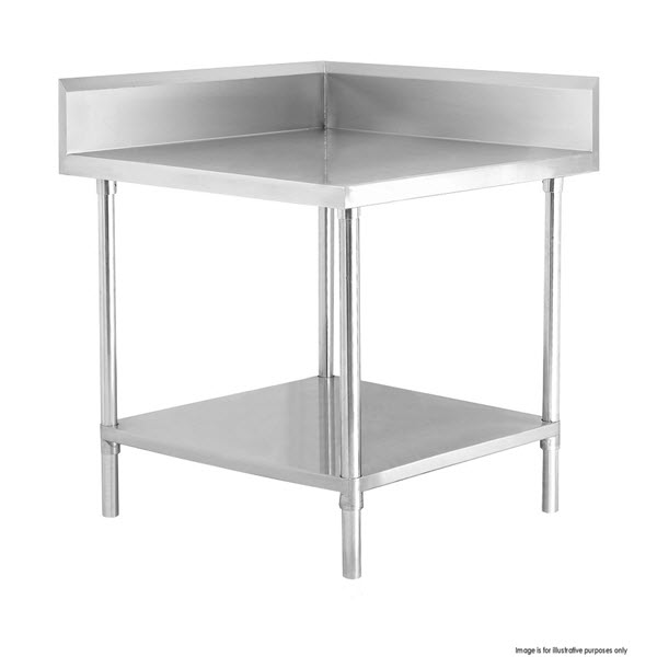 All Stainless Steel Corner Workbench with Splashback and Solid Undershelf 600mm Wide 600 mm deep × 900 mm high Specially designed for quick & simple assembly Comes with instruction manual & tools Supplied flat-packed for ease of transport Locking drawers available* Legs 1.2 mm S/S; 42 mm Ø Fully adjustable S/S polished disc feet that match the legs perfectly Castor kits available (lockable) Benchtops 1.2 mm material; SUS304 (18/8) Llined with XPS board, 20 mm thick & S/S panel Special S/S ‘U’ channel reinforcements under As the bench size increases so does the number of channels Undershelves Height of shelf is fully adjustable, also an extra shelf can be added 1.2 mm S/S Special ‘U’ channel reinforcements under to suit the bench type & size, and as the bench size increases so does the ‘U’ channel width; S/S 1.2 mm thick Splashbacks Stainless steel backing All S/S lined & bevelled 180 mm high; 30 mm thick Fully enclosed & folded under top (not gal. or open)