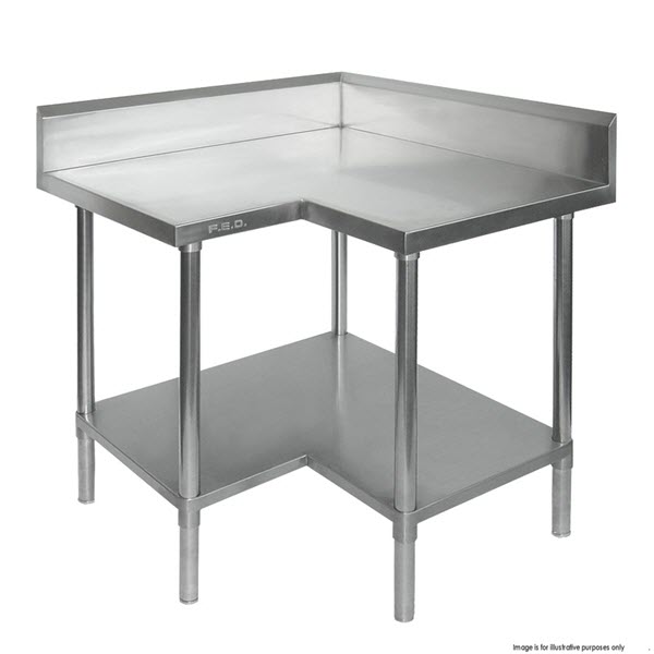 All Stainless Steel Corner Workbench with Splashback and Solid Undershelf 150mm Splashback 900mm Wide x 900 mm deep × 900 mm high Specially designed for quick & simple assembly Comes with instruction manual & tools Supplied flat-packed for ease of transport Locking drawers available* Legs 1.2 mm S/S; 42 mm Ø Fully adjustable S/S polished disc feet that match the legs perfectly Castor kits available (lockable) Benchtops 1.2 mm material; SUS304 (18/8) Llined with XPS board, 20 mm thick & S/S panel Special S/S ‘U’ channel reinforcements under As the bench size increases so does the number of channels Undershelves Height of shelf is fully adjustable, also an extra shelf can be added 1.2 mm S/S Special ‘U’ channel reinforcements under to suit the bench type & size, and as the bench size increases so does the ‘U’ channel width; S/S 1.2 mm thick Splashbacks Stainless steel backing All S/S lined & bevelled 180 mm high; 30 mm thick Fully enclosed & folded under top (not gal. or open)